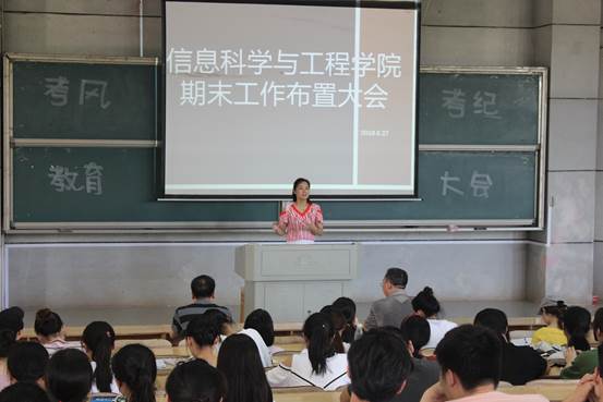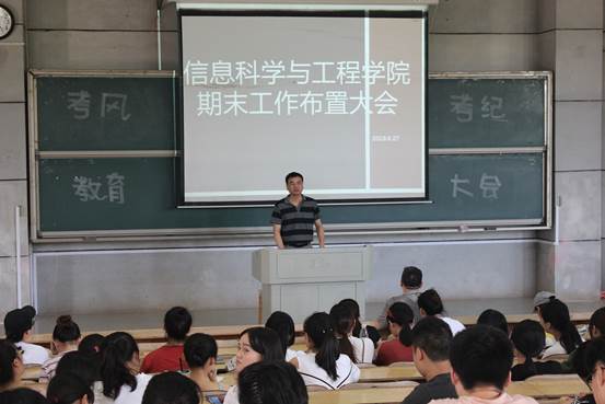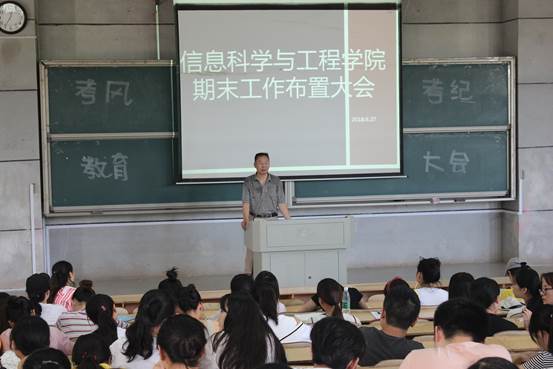 为进一步加强公司学风建设,端正考风考纪,明确诚信参考意识,保证期末考试的顺利进行。6月27日中午,信息科学与工程公司于理报厅一召开期末工作布置大会。公司党总支书记王杰文教授,副经理王建军教授,党总支副书记易利老师,学工办关红儒和唐瑞鸿老师出席会议,各班班干部、公司员工干部及员工党员共计200余人参加此次会议。大会由关红儒老师主持。