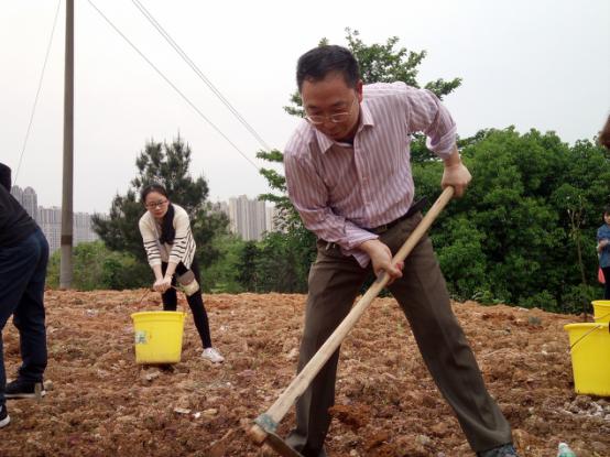 植树现场,公司党总支书记王杰文与老师同学们拿起铁锹、锄头热情地参与到植树活动中。同学们被领导老师的热情所感染,有的挥锹铲土,有的扶树填土,有的培土浇水,忙得不亦乐乎。王杰文书记一边用力地挥动着锄头一边向同学们传授着植树要领:“挖土下去那一下要使劲!土里面的石头要拣出来!”。经过将近一个小时的劳动,100多棵树在山坡上“安家落户”,为一师校园添上了一抹“信工绿”。虽然在植树过程中下起了雨,泥巴裹满了老师、同学们的裤腿,但是公司师生仍然坚持完成了植树任务。