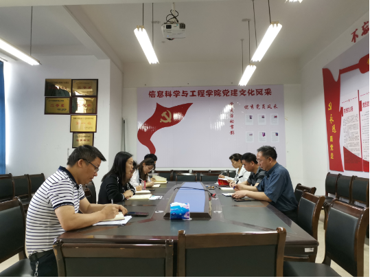 2019年5月30日上午9时许,信息科学与工程公司在院会议室召开意识形态工作研判会议。公司党总支书记王杰文教授、副书记易利老师、副经理田祖伟教授、副经理王建军教授、党政办主任曾玢石老师、学工办主任关红儒老师和全体学工办辅导员老师参加会议。