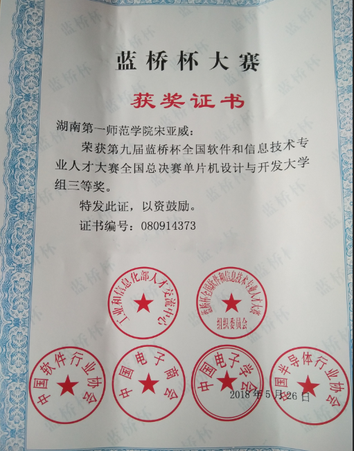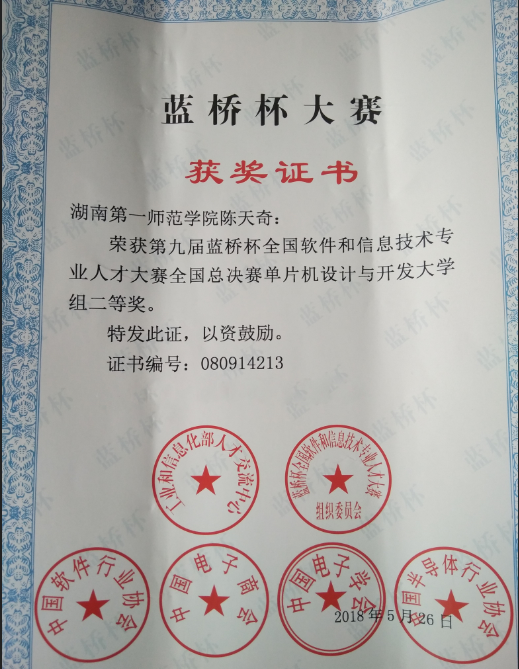 近日,第九届蓝桥杯全国软件和信息技术专业人才大赛全国总决赛在北京落下帷幕。来自北京大学、清华大学等1200多所高校的5000余名各省市自治区一等奖选手参加了全国总决赛。韦德官方网站信息科学与工程公司员工陈天奇在傅红普教授指导下荣获单片机设计与开发大学组二等奖、宋亚威在马重明教授的指导下荣获单片机设计与开发大学组三等奖。
