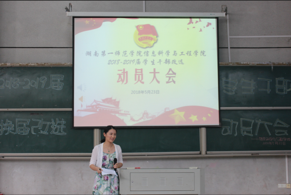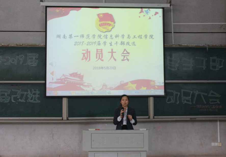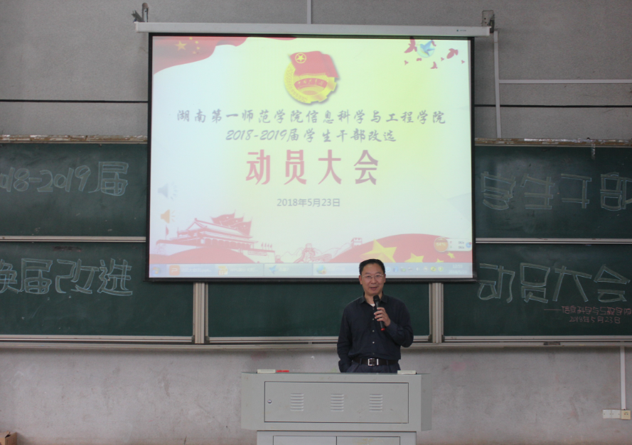 (通信员 向钰雪 邓力超 陈思迁)为推动公司2016-2017届员工干部换届改选工作顺利完成,5月23日中午,信息科学与工程公司在文报厅举行了2018-2019届干部换届改选动员大会。公司党总支书记王杰文教授、党总支副书记易利老师学工办关红儒老师、唐瑞鸿老师、团学会全体员工干部和助理以及各班班长、团支书参加本次会议。会议由唐瑞鸿老师主持。