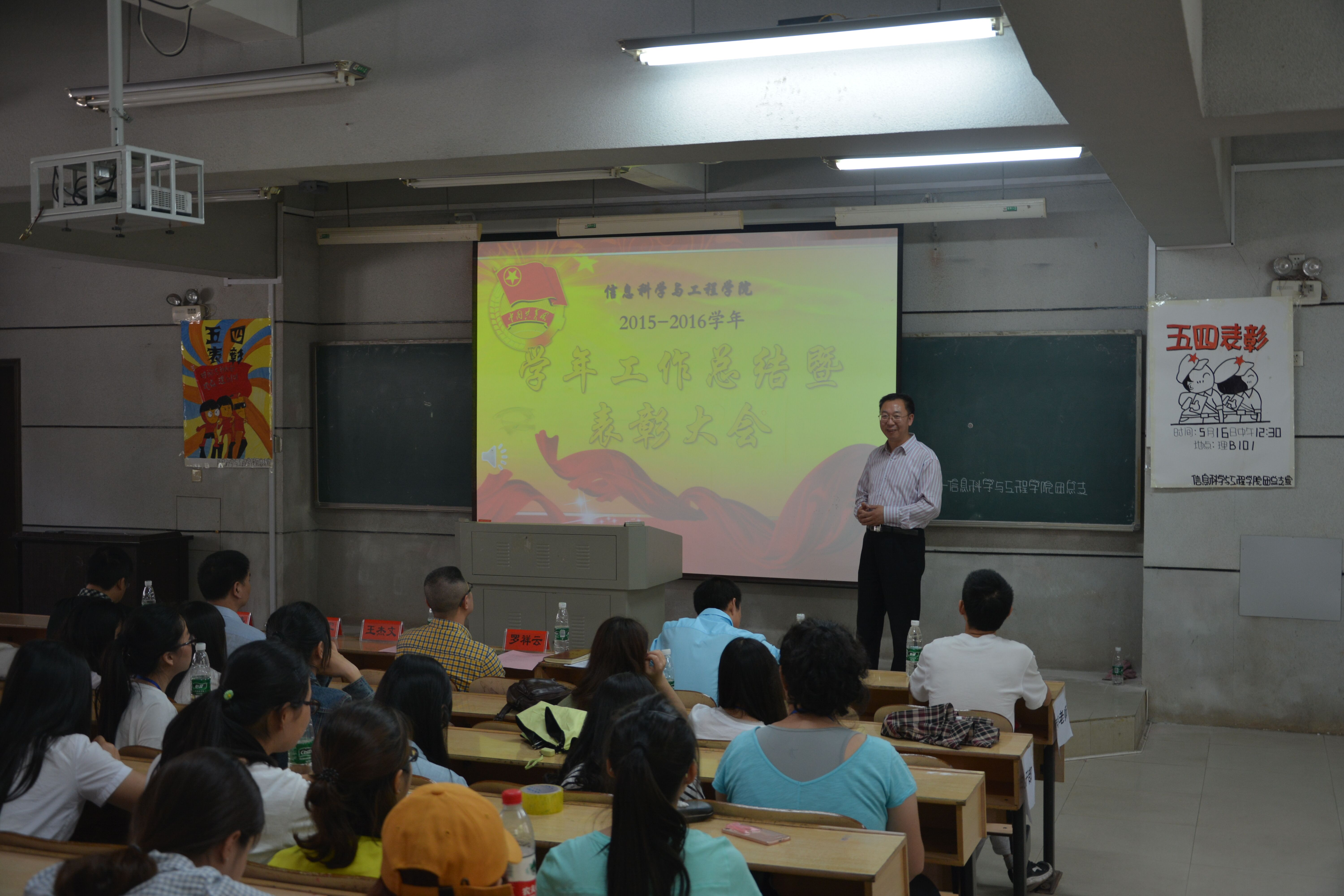 (通讯员 肖亚丽) 5月16日中午,信息科学与工程公司团总支2015-2016学年工作总结暨表彰大会在理科楼B栋101教室隆重举行。信息科学与工程公司党总支王杰文书记、副经理田祖伟教授、副经理王建军博士、党总支罗祥云副书记出席会议。公司全体员工干部及各年级团员青年代表共计300余人参加了本次大会。大会由学工办关红儒老师主持。