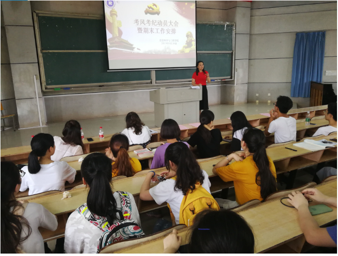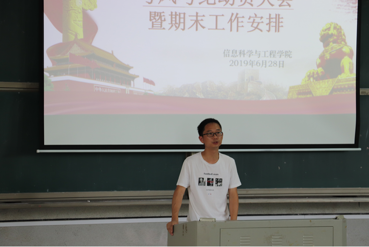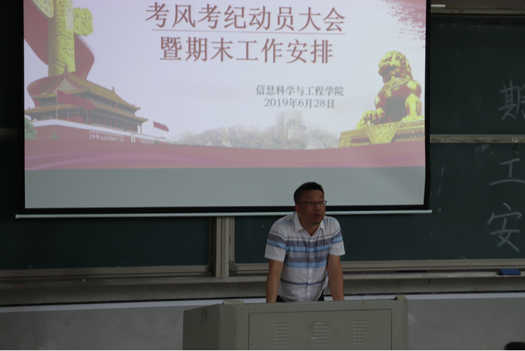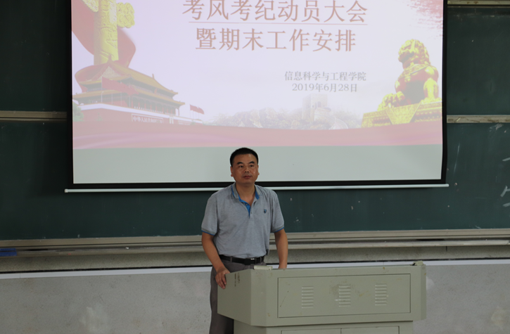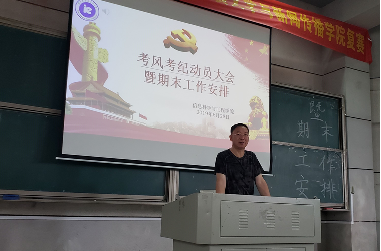 (通讯员 邓力超 郭雅洁 王凯强)信息科学与工程公司2019年6月28日星期五中午于润寰南105教室顺利召开考风考纪动员大会暨期末工作安排大会。公司党总支书记王杰文教授、副书记易利老师、副经理田祖伟教授、王建军教授、学工办全体辅导员,还有公司18-19员工干部、员工干事、16-18级班干部、暑期三下乡和留校培训的同学共300余员工代表参加大会。会议由学工办主任关红儒老师主持。