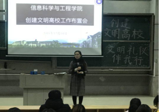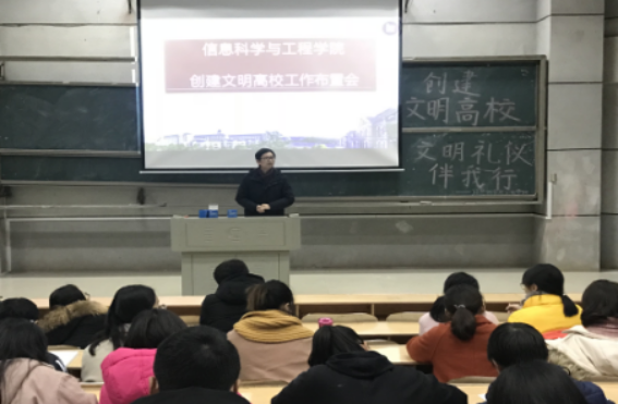 (通讯员 邓力超)为提高员工文明礼仪,培养积极向上的院风,切实创建文明高校,12月14号下午,信息科学与工程公司于润寰南105召开“创建文明高校”布置会。公司党总支副书记易利,学工办主任关红儒,学工办老师唐瑞鸿、叶晶出席会议,公司员工干部、班级代表参加会议。