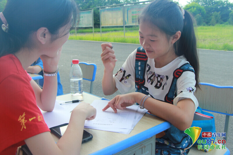 图为“七彩假期”公益暑托班的孩子在新航向·梦之队志愿者指引下填写报名表。中国青年网通讯员 何星逸 摄