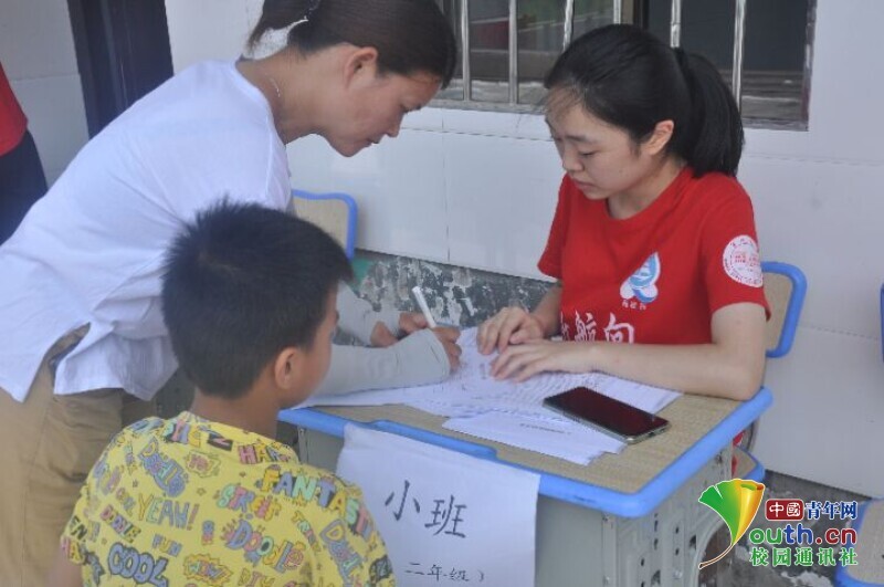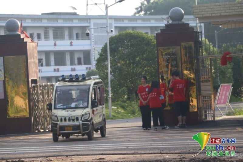 图为新航向·梦之队的队员在校门口引导孩子和家长进入校园报到。中国青年网通讯员 段新利 摄
