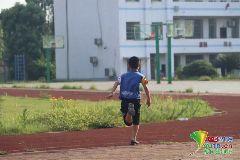 图为“七彩假期”公益暑托班员工得知自己是第一位报到的员工时,开心的满场奔跑。中国青年网通讯员 欧阳健 摄