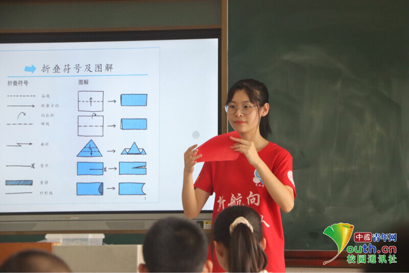 图为“红心向党”趣味手工课老师示范红心折纸步骤,老师正在对折红色卡纸。中国青年网通讯员 段新利 摄