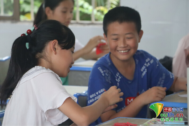 图为“红心向党”趣味手工课上,小朋友探头给旁边的人示范红心折纸步骤,旁边的小朋友腼腆的笑着。中国青年网通讯员 欧阳健 摄