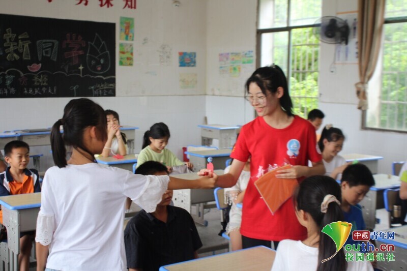 图为志愿者向孩子们演示如何将一张张彩纸彩纸折叠成爱心的形状。中国青年网 段新利 摄