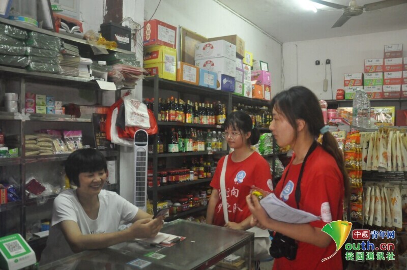 图为新航向·梦之队志愿者向超市阿姨发放调查问卷,介绍国家老员工资助政策。中国青年网通讯员 段新利 摄