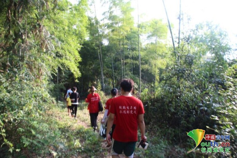 图为当地居民带领新航向·梦之队队员前往老党员的居住地。中国青年网通讯员 欧阳健 摄