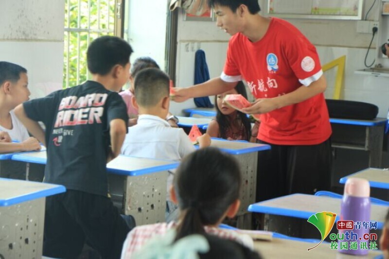 图为炎炎夏日队员正在给孩子们分发西瓜,给大家解暑。 中国青年网通讯员 段新利 摄