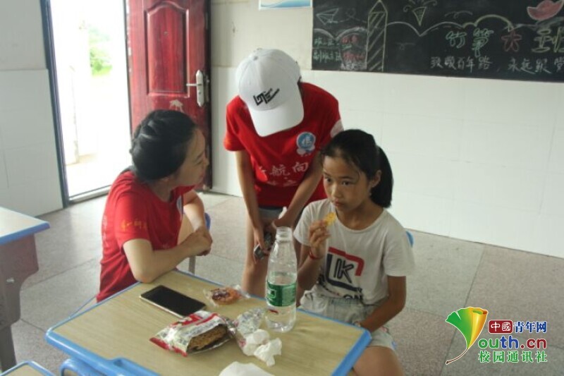 图为孩子每天上学家里没有准备早餐,队员为她准备水和食物给她补充能量。 中国青年网通讯员 段新利 摄