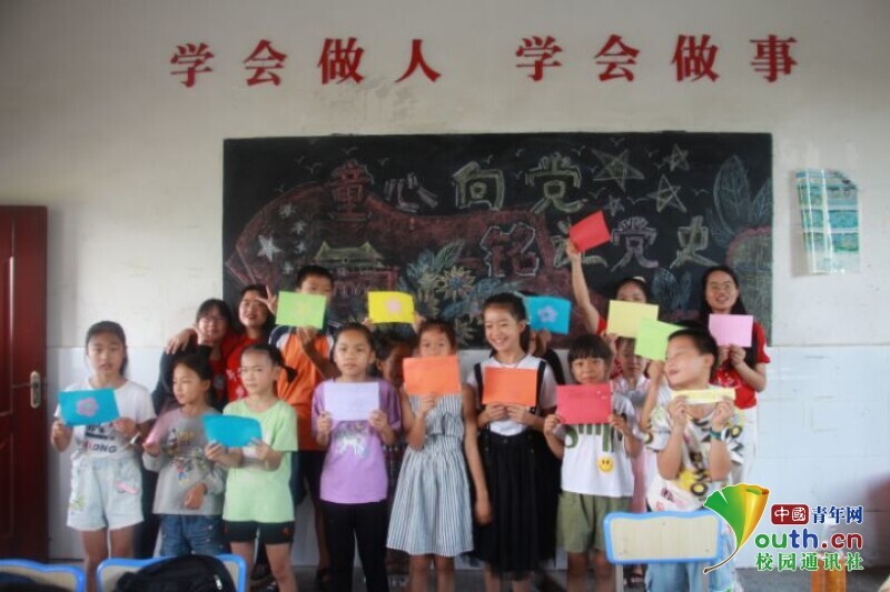 图为孩子们一同向镜头展示亲手写给革命先烈的信,并露出灿烂的笑容。中国青年网通讯员 欧阳健 摄
