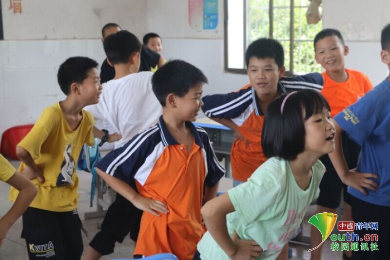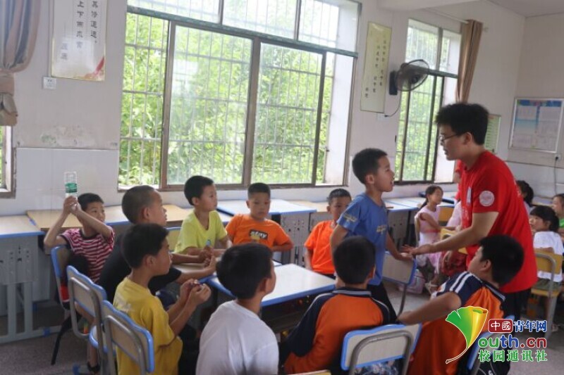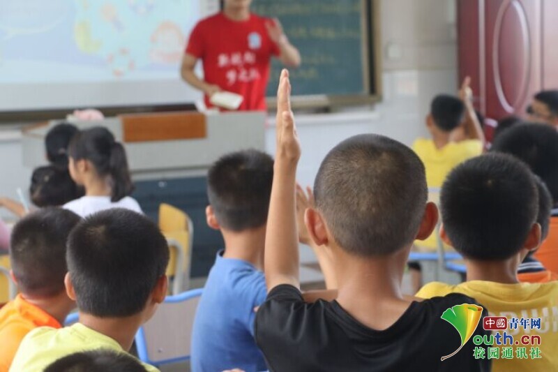 图为队员对小朋友们进行分组,让他们举手回答问题“PK”,激发小朋友们的学习兴趣。中国青年网通讯员 段新利 摄