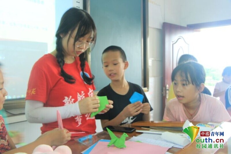 图为手工兴趣班上“小老师”手把手教孩子们折他们最爱的“小恐龙”,孩子们兴致勃勃地围着“小老师”。中国青年网通讯员 王彬艳 摄