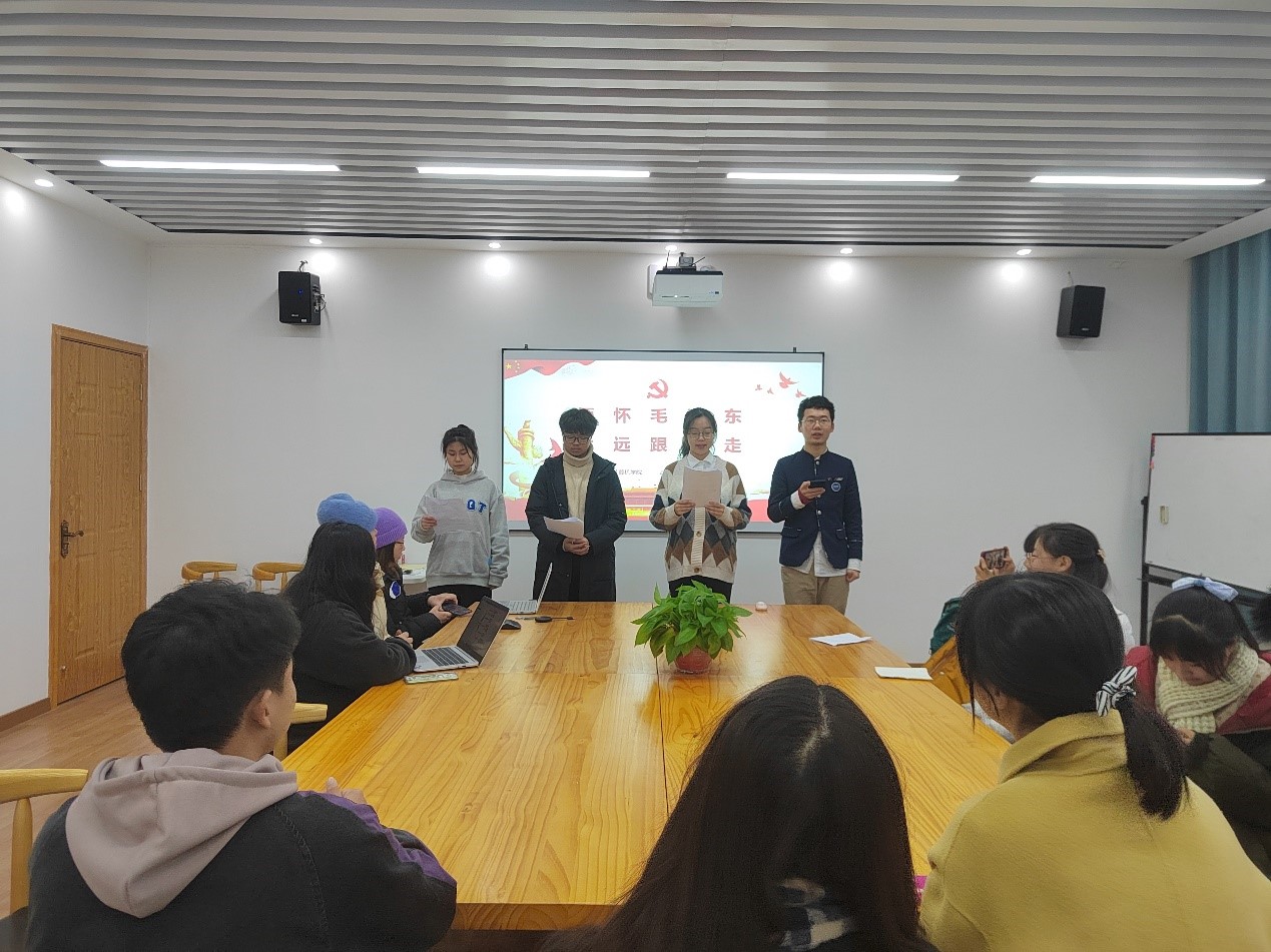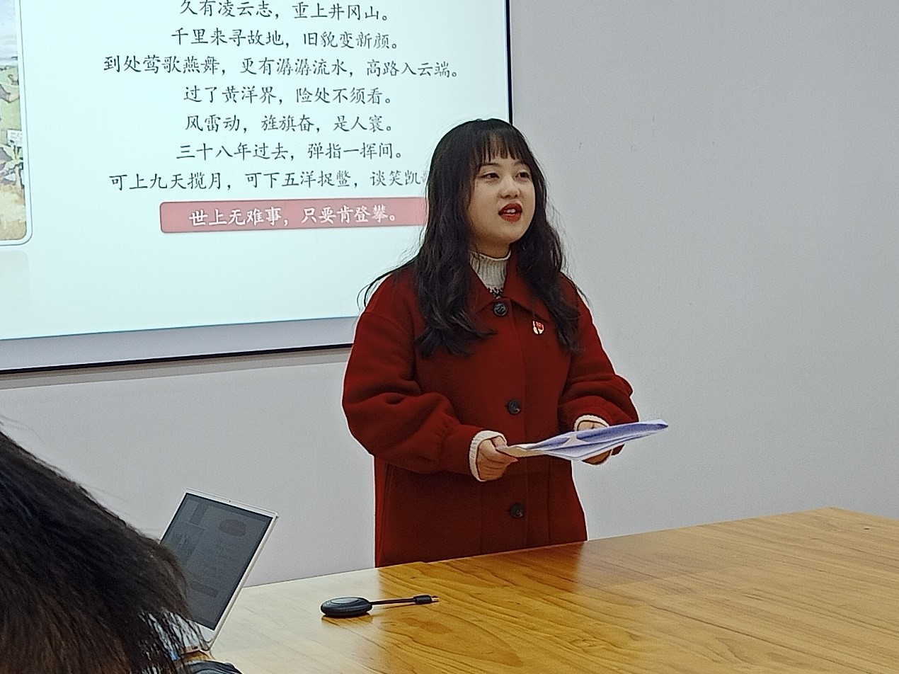 员工党员谢晓通过毛主席旷达豪迈的经典诗词分析出其艰苦朴素、严于律己、波澜壮阔、豪情万丈的形象,来向同学们心目中永远的毛主席致敬并激励同学们不忘来时路,勇敢向前行。