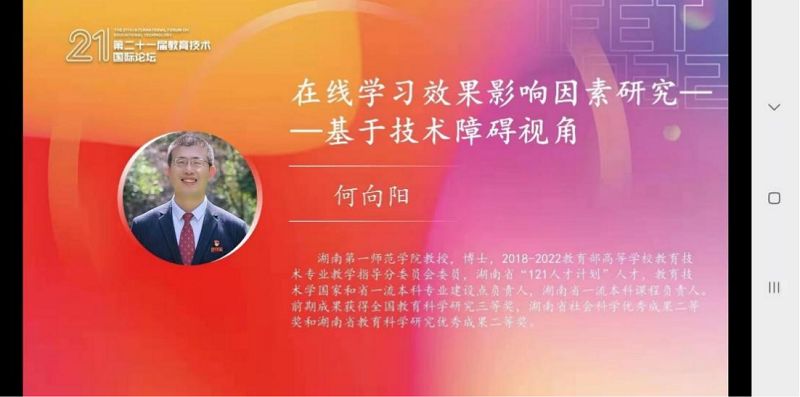 11月19日至11月20日,第21届教育技术国际论坛(IFET2022)在沈阳师范大学召开。公司何向阳教授受邀在嘉宾学者论坛做题为“在线学习效果影响因素研究——基于技术障碍视角”的学术报告。