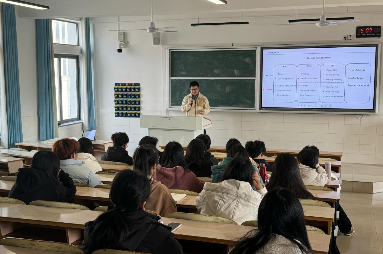 刘齐军的报告主题为《隐私计算简介与部分案例分享》,他从个人信息保护和数据泄露问题引入了隐私计算领域的发展与重要性,带领大家从安全多方计算、联邦学习、可信执行环境、差分隐私四个方面走进了隐私计算的世界。刘齐军通过讲述数据共享协同的应用案例,如教育训练资源共享协同、医疗行业数据要素流通平台等,使同学们加深了对区块链和隐私计算技术实际应用的理解。