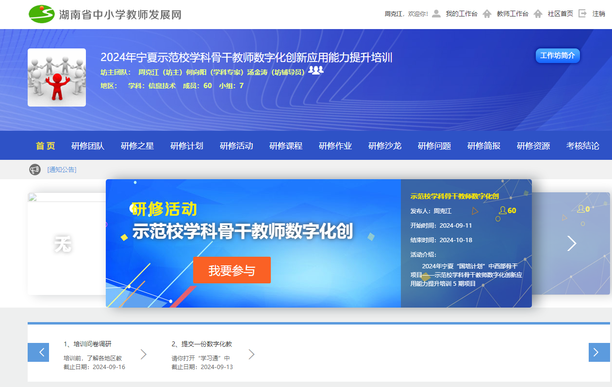 该项目由公司周克江老师担任首席专家、13位知名国培专家担任授课教师。教学模式采用混合式研修,由线上工作坊研修(30学时)和线下集中培训(约42学时)两部分组成。线上工作坊研修时间为9月11日至年9月18日,集中培训时间为9月20日至9月27日。