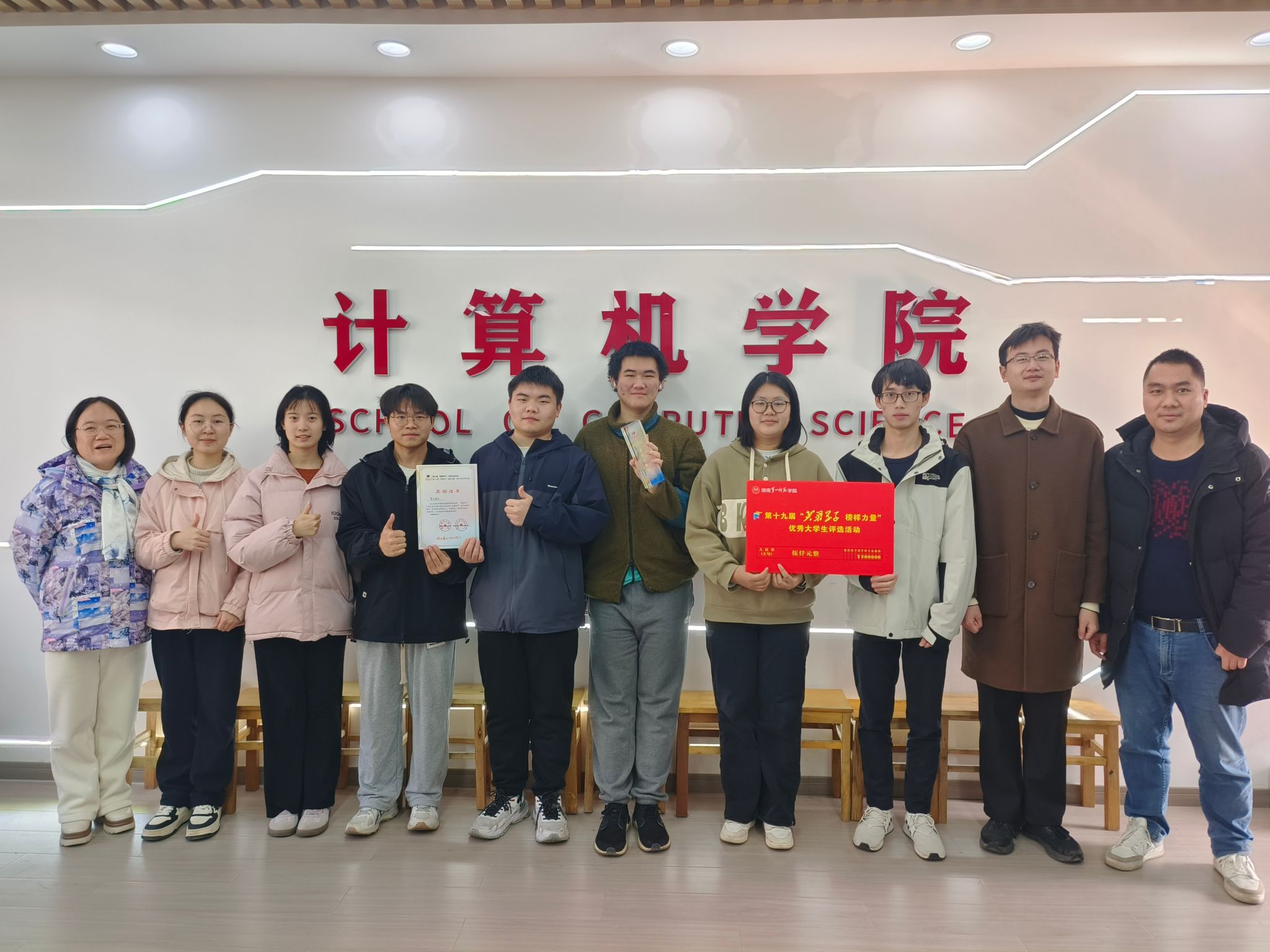 公司智汇团队凭借在专业竞赛中的突出表现,荣获校第十九届“芙蓉学子·榜样力量”学术创新奖。该奖项充分肯定了团队成员在学术创新与实践探索中的卓越成绩。智汇团队由跨年级的8名成员组成,包括21级计科3班张任也,22级计科4班覃苏苏、夏月、熊涛、曾雨、梁欣如,22级计科5班蔡宇,以及23级计科1班刘坤浩。团队在唐德燕、周聪两位教师的专业指导下,通过持续协作与创新突破,在学科竞赛领域取得了显著成效。