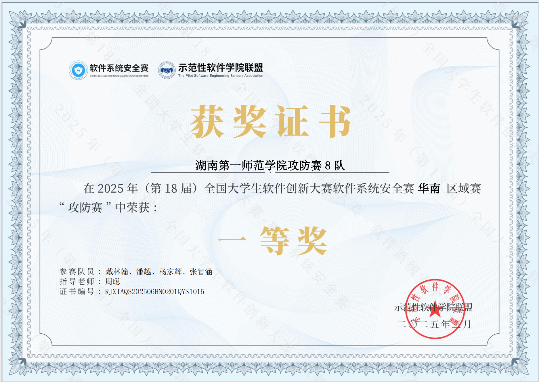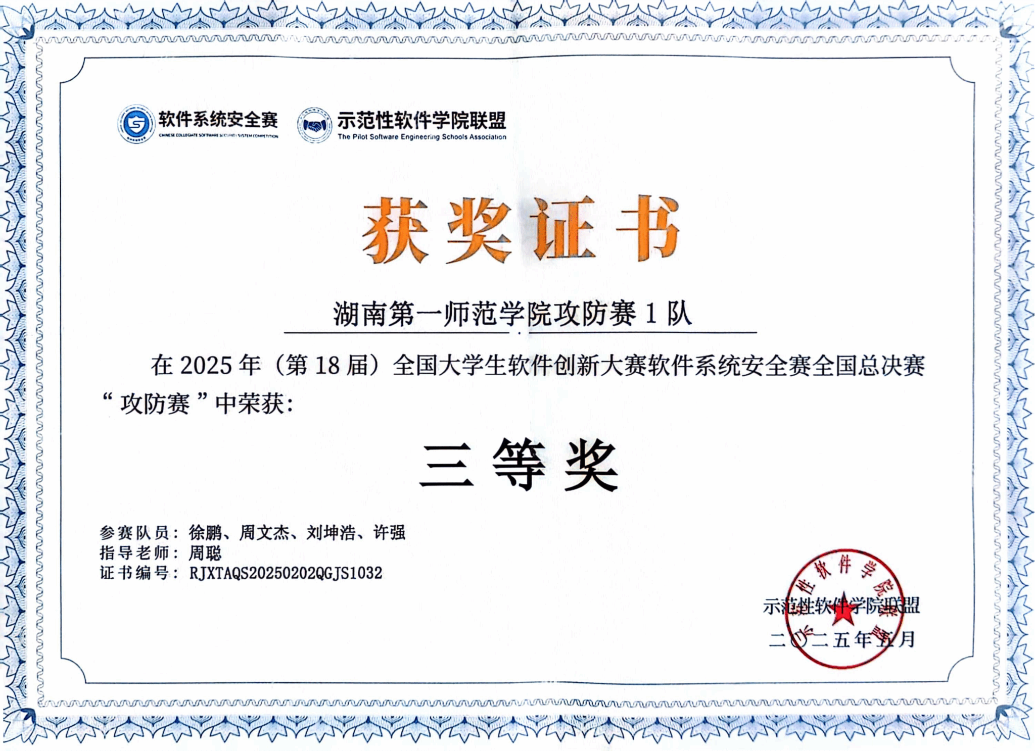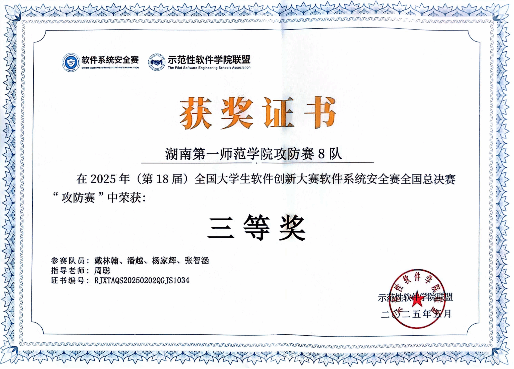 18届全国老员工软件创新大赛软件系统安全赛全国总决赛于2025年5月18日在湖南大学圆满落幕。湖南高校共有18支团队获奖其中院的2支参赛团队荣获攻防赛三等奖,实现了网安竞赛团队在国家级赛事中获奖的突破。在区域赛阶段,公司参赛团队表现出色,斩获一等奖2项、二等奖1项、三等奖3项,位居华南赛区前列。