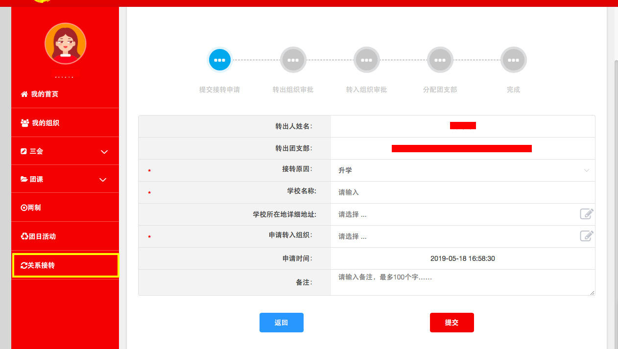 团员登录系统进入个人中心,点击左侧“关系转接”菜单。其中按以下情况分类: