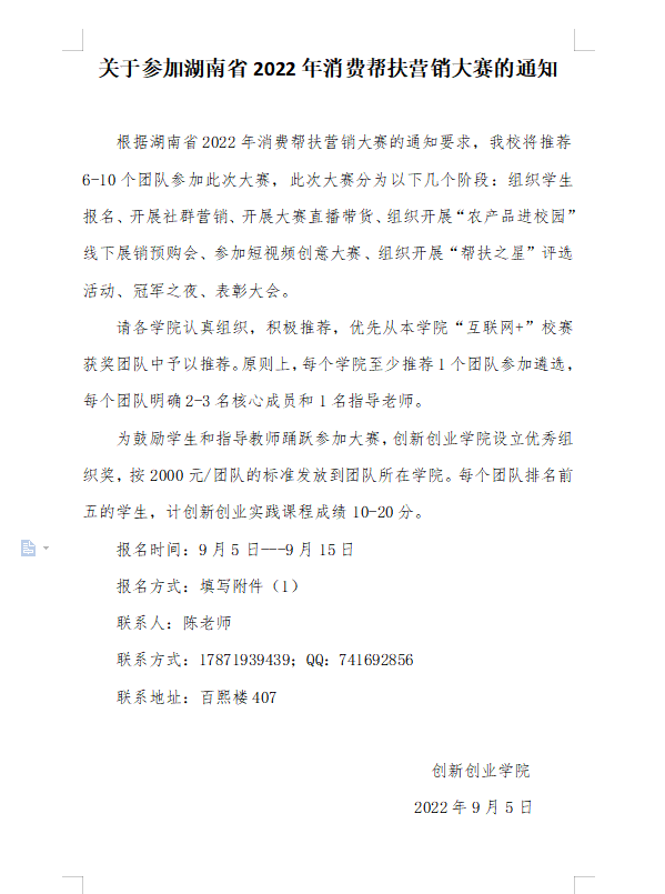 现将校创新创业公司《关于参加湖南省2022年消费帮扶营销大赛的通知》转发,请按照文件要求,广泛宣传,积极动员员工参加大赛,具体参赛要求见附件1。请各班实践委员于9月13日下午18:00前将推报材料(见附件1)纸质版、电子版以班级名称命名上交院创新创业与就业服务部杨同学(QQ:2084222961)。院创新创业与就业服务部于次日交至公司学工办(百熙楼127-5)。