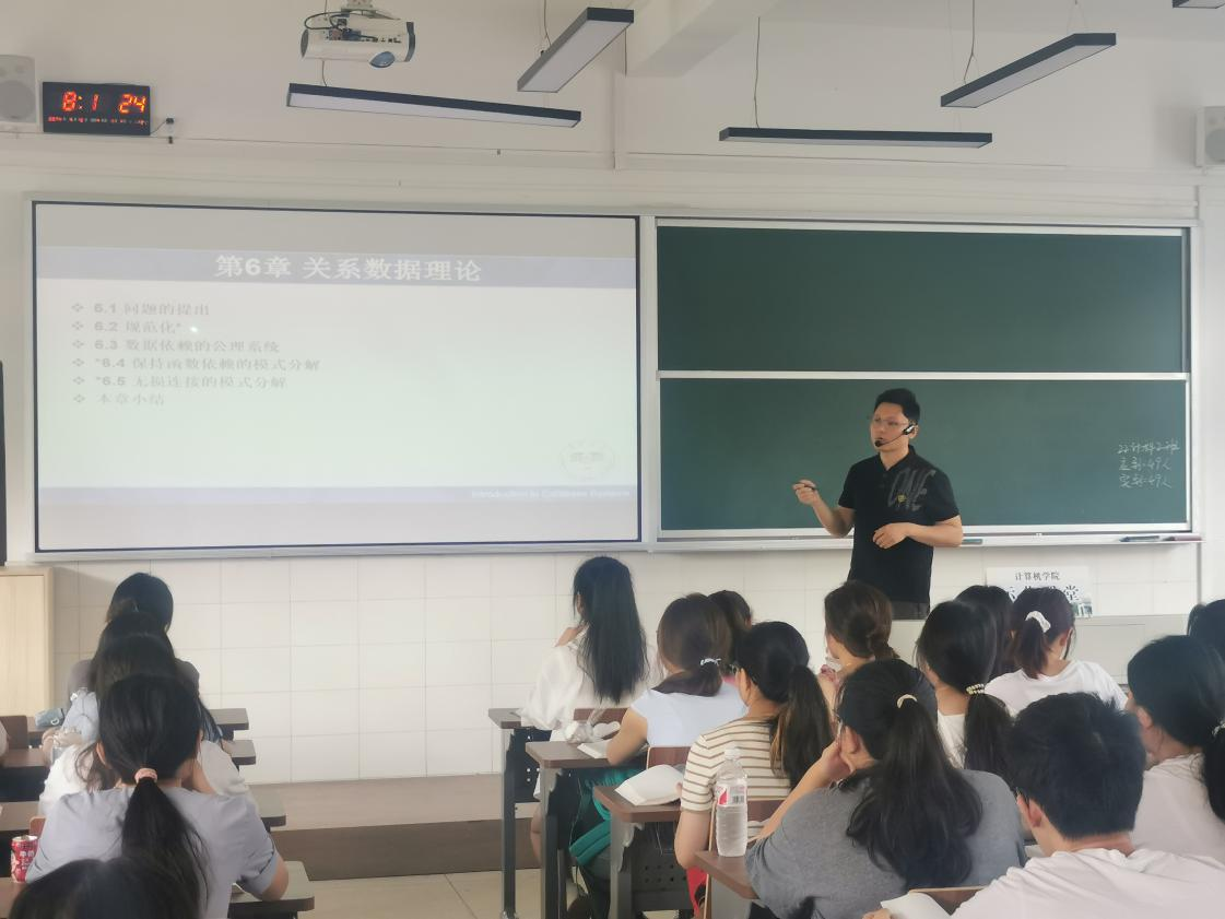 5月16日上午,林开彬在玉衡楼506为22计科2班的同学主讲了《数据库原理及应用》课,内容是关系数据理论中的函数依赖。林开彬利用思维导图的形式回顾了数据库完整性的相关内容,为本节内容的讲授做了较好的铺垫。他通过高校应用开发中的实例引出关系数据理论的必要性,极大地激发了员工的学习兴趣。整堂课上,林开彬教学的亲和力使课堂氛围轻松愉快,员工们的听课效果较好